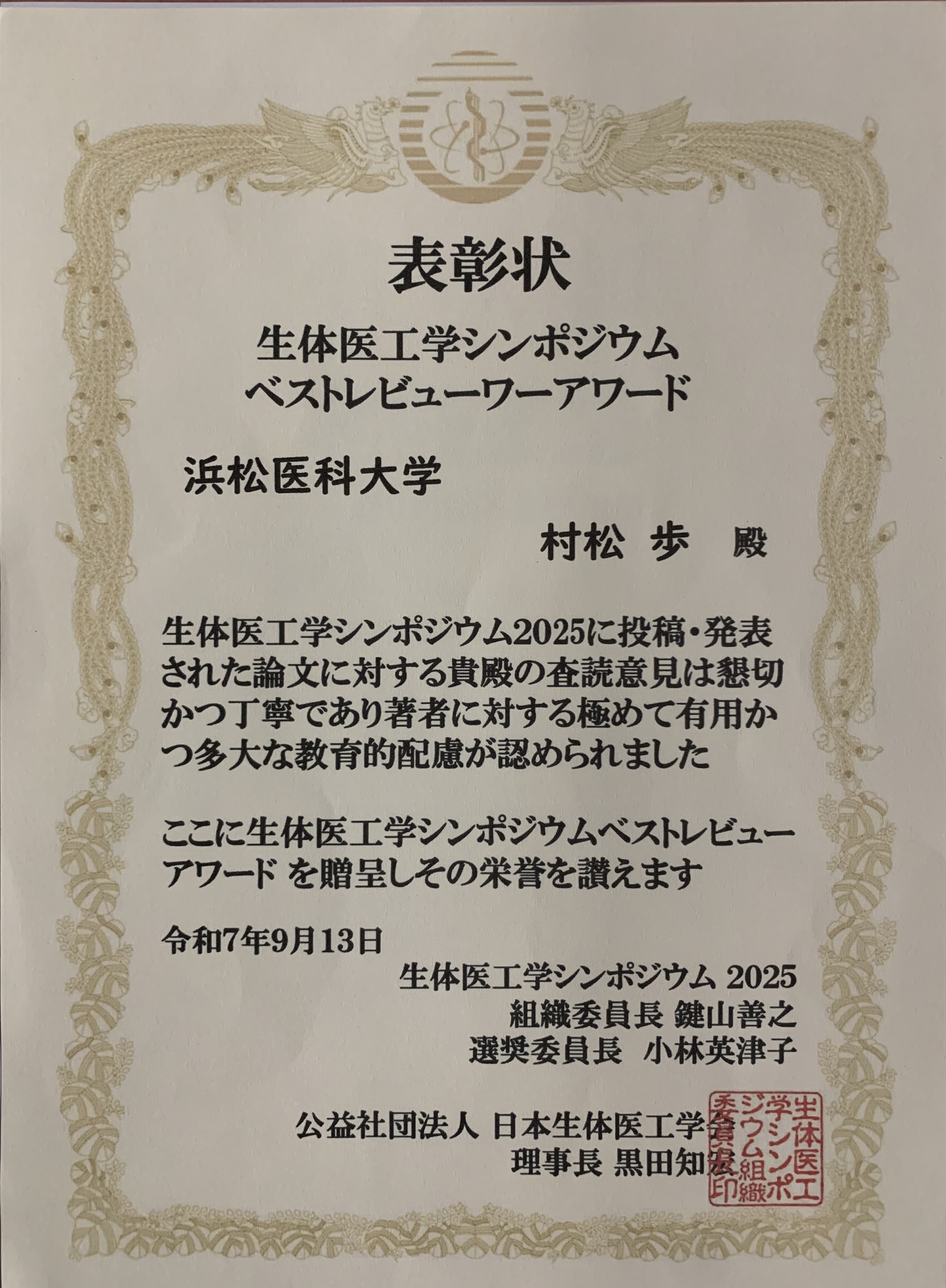 この賞は、生体医工学シンポジウム2025へ投稿された論文に対し質の高い査読を行った者に対して贈られるものです。