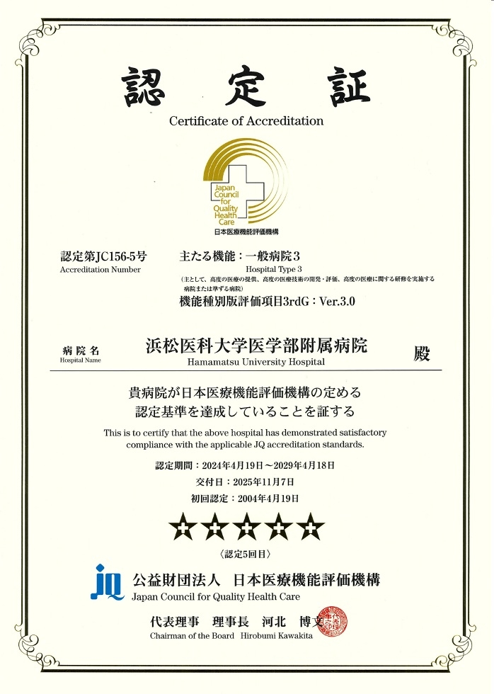 今回の評価によって向上した医療の質のさらなる強化をめざし、引き続き努力を続けてまいります。