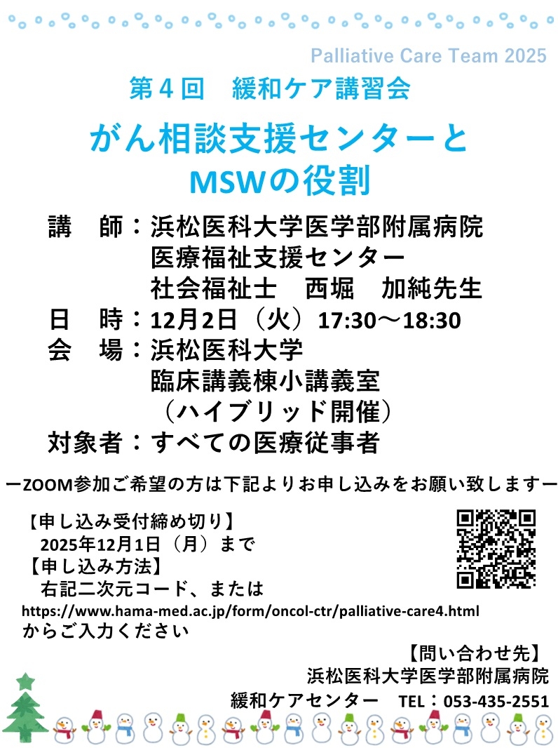 令和7年12月2日(火)令和7年度第4回緩和ケア講習会を会場聴講とオンライン視聴のハイブリッドにて開催します。今回は「がん相談支援センターとМSWの役割」と題して、本院 医療福祉支援センター 社会福祉士 西堀 加純先生にご講演いただきます。