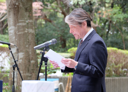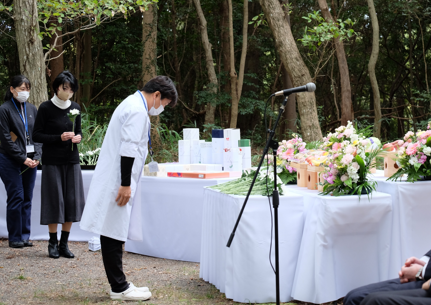 11月13日(木)午後、動物慰霊塔前において令和7年度動物慰霊祭を執り行い、約70名の教職員が参列しました。 本学における医学の研究と教育のために実験に供された数多くの諸動物に対し、感謝の意を表するとともに、その霊の安らかなることを祈念するために催したものです。 黙祷の後、佐藤医用動物資源支援部長の慰霊の詞に続き、参列者全員による献花を行いました。