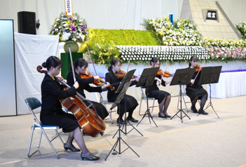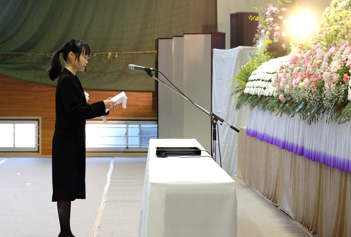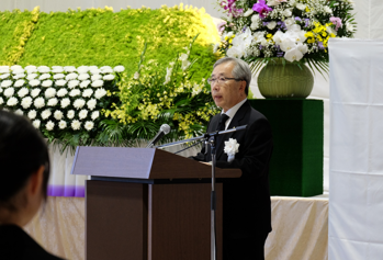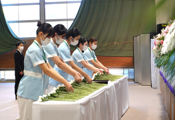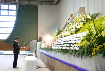 式では、御霊に黙祷を捧げた後、学生管弦楽団による演奏、本学卒業生である中島芳樹教授による献体者ご芳名の奉読が行われました。続いて、本学職員を代表する梅村理事、白菊会代表、新天会代表、学生代表がそれぞれ追悼の辞を述べ、学長の挨拶に引き続き、出席者全員が祭壇に献花を捧げました。
