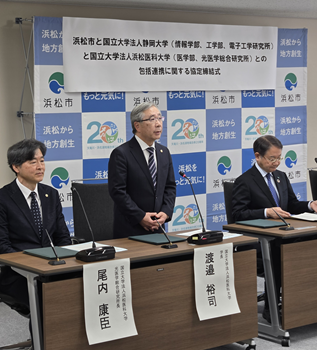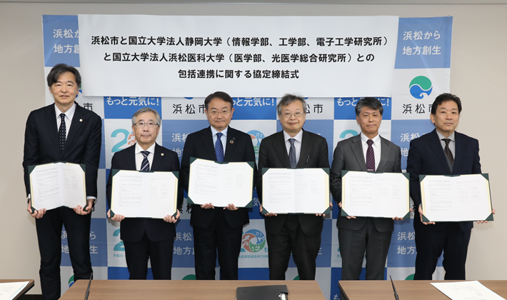 浜松市と静岡大学浜松キャンパス(情報学部・工学部・電子工学研究所)と本学(医学部・光医学総合研究所)が、令和7年12月16日(火)に包括連携協定を締結いたしました。 教育、学術研究、健康・医療・福祉、産業振興等において、相互に協力・連携し、地域社会の発展と人材育成に寄与してまいります。