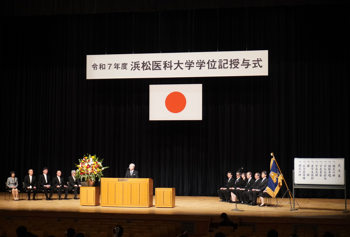 式では、学位記の授与、医学科2名及び看護学科1名の成績優秀者に対する学生表彰に続き、渡邉学長から、「浜松医科大学で学んだことに誇りを持ち、大学で得たさまざまな縁を大切にし、他者を尊重しながら歩んでください。患者さん、共に働く仲間、そして皆さんを支えてくれる家族を尊重し大切にする姿勢こそが、信頼される医療人の基盤となります。皆さん一人ひとりの歩みが、多くの人々の希望となり、よりよい未来の医療を築いていかれることを心から願っています。」との式辞がありました。