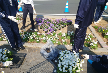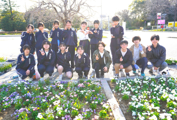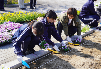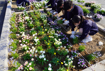 また、本取り組みの一環として、3月23日(月)に浜松日体中・高等学校 社会福祉部の皆さんと、本学サークルNOVALAの学生が参加し、ロータリー入口の4区画に春の花を植えました。中高生と大学生が混成の4グループに分かれ、それぞれに工夫を凝らし、色とりどりの花々で花壇を彩りました。