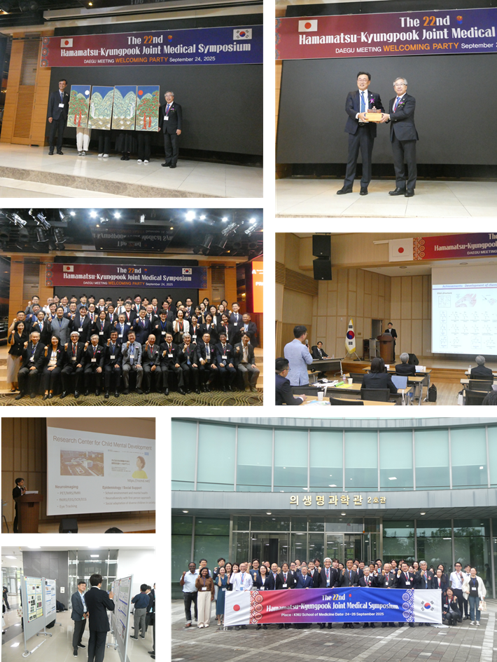 From September 24 (Wed.) to September 26 (Fri.), 2025, the 22nd Kyungpook-Hamamatsu Joint Medical Symposium was held at Kyungpook National University School of Medicine (KNUSM) and College of Nursing (KNUCN) in Daegu, Korea. This symposium is organized annually on a rotating basis by the KNU side and Hamamatsu University School of Medicine (HUSM), which maintain an academic exchange agreement. This year, a total of 27 participants from HUSM took part.